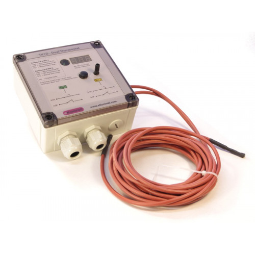 Dubbeltermostat med två stycken separat ställbara termostater som har varsitt relä och varsin temperaturgivare. Varje termostat har egna ställbara till- och frånslagstemperaturer. I princip som två stycken TK1A i samma enhet, förutom att TK1D ej går att ställa för inverterad drift (kyldrift).